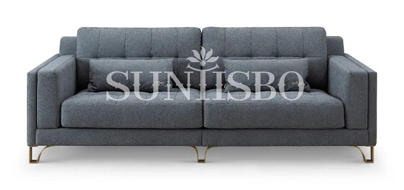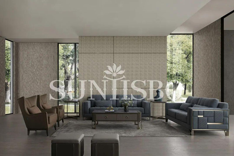 沙發(fā)采用細(xì)膩的顆粒感皮料,不僅增加了霧霾藍(lán)色彩的飽和度,也在視覺(jué)上充實(shí)了空間的安全感。輪廓,扶手皆為干練利落的直線,放眼望去不僅簡(jiǎn)化了空間,也傳達(dá)著對(duì)精簡(jiǎn)生活的追求。