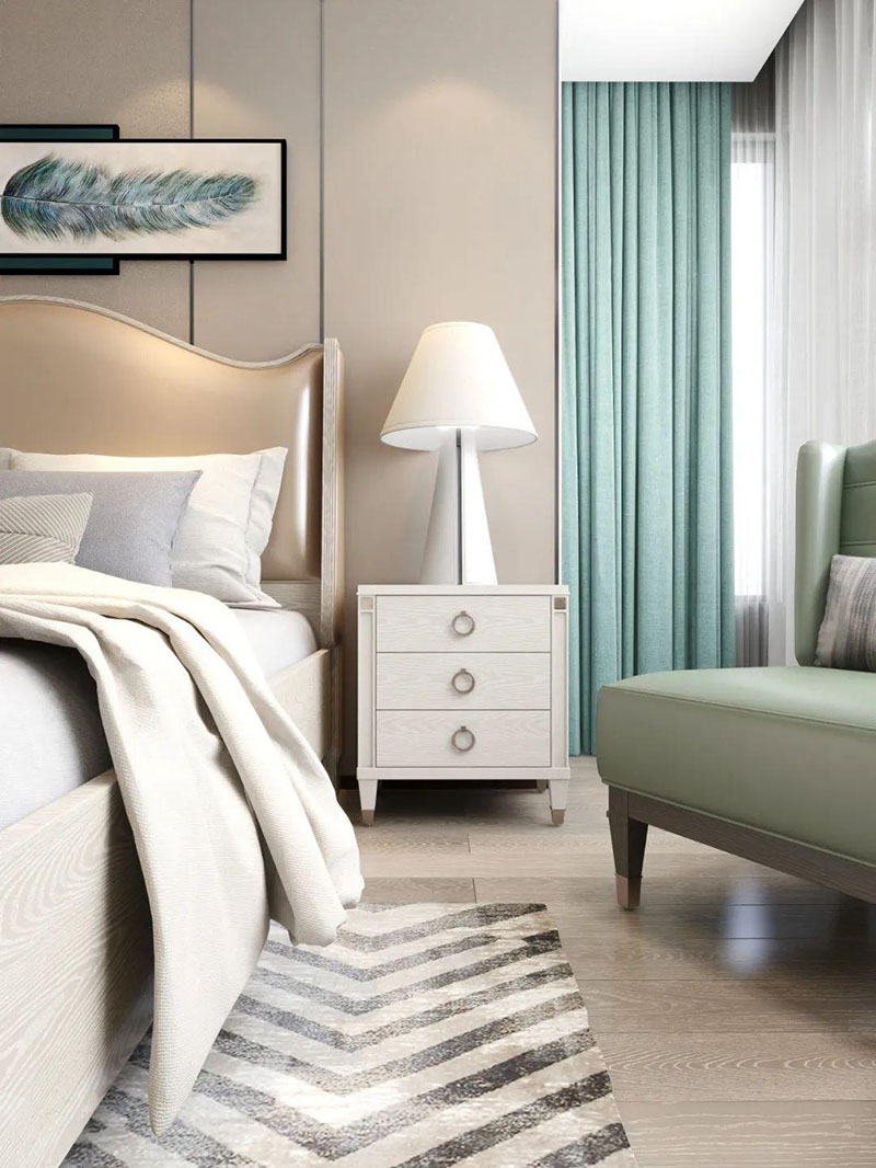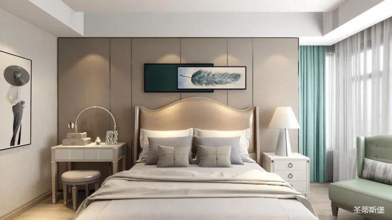 ▲次臥空間主要是以淺色為底調(diào),大面積的莫蘭迪色與淺色相平衡。極強(qiáng)線性裝飾畫帶來的延伸感讓視覺煥然一新。少許的金屬元素?cái)z入,瞬間提升了空間的精致度,將溫潤雅致與時(shí)尚輕奢糅合在同一空間里,每一處都洋溢著浪漫的氣息。
