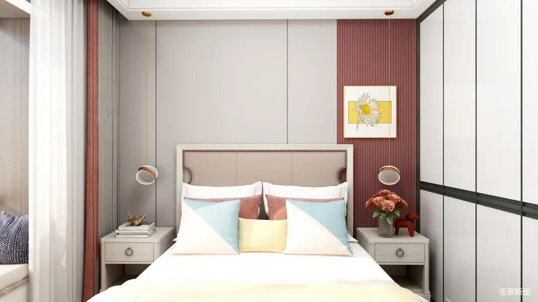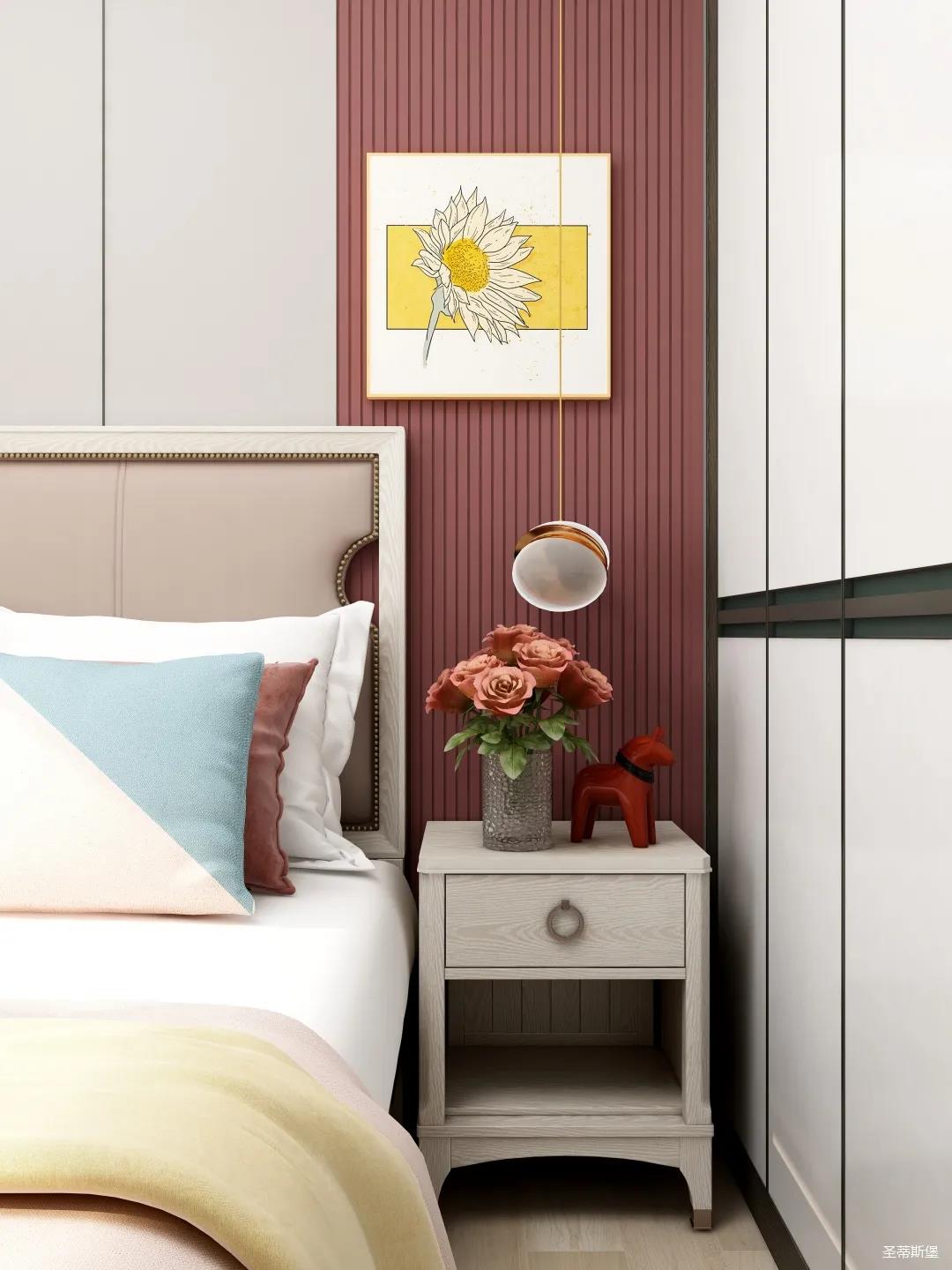 兒童空間雖不及其他空間寬敞,但細節(jié)設(shè)計更為貼心,淡粉的床屏與酒紅木飾面形成深淺色的對比,色彩跳躍,洋溢著兒童應(yīng)有的青春活力。床前的閱讀燈,讓空間設(shè)計感up的同時,也便利了兒童的閱讀學(xué)習(xí)。