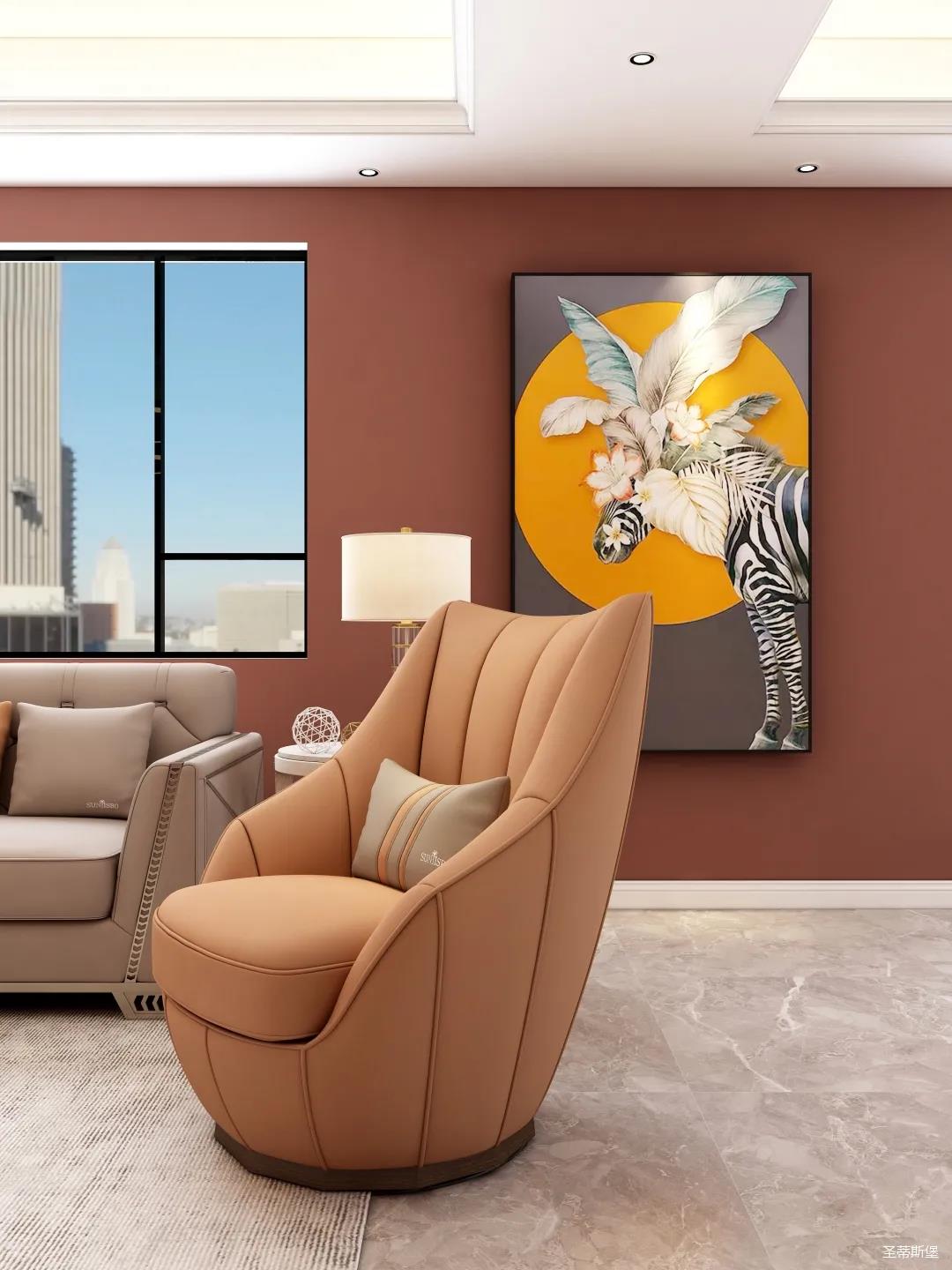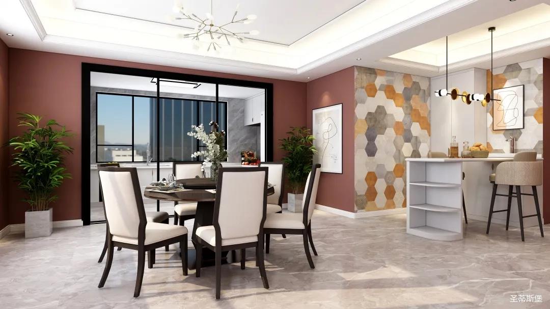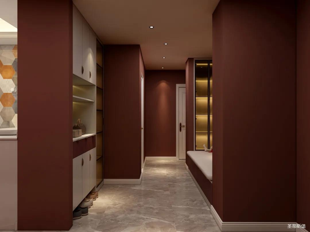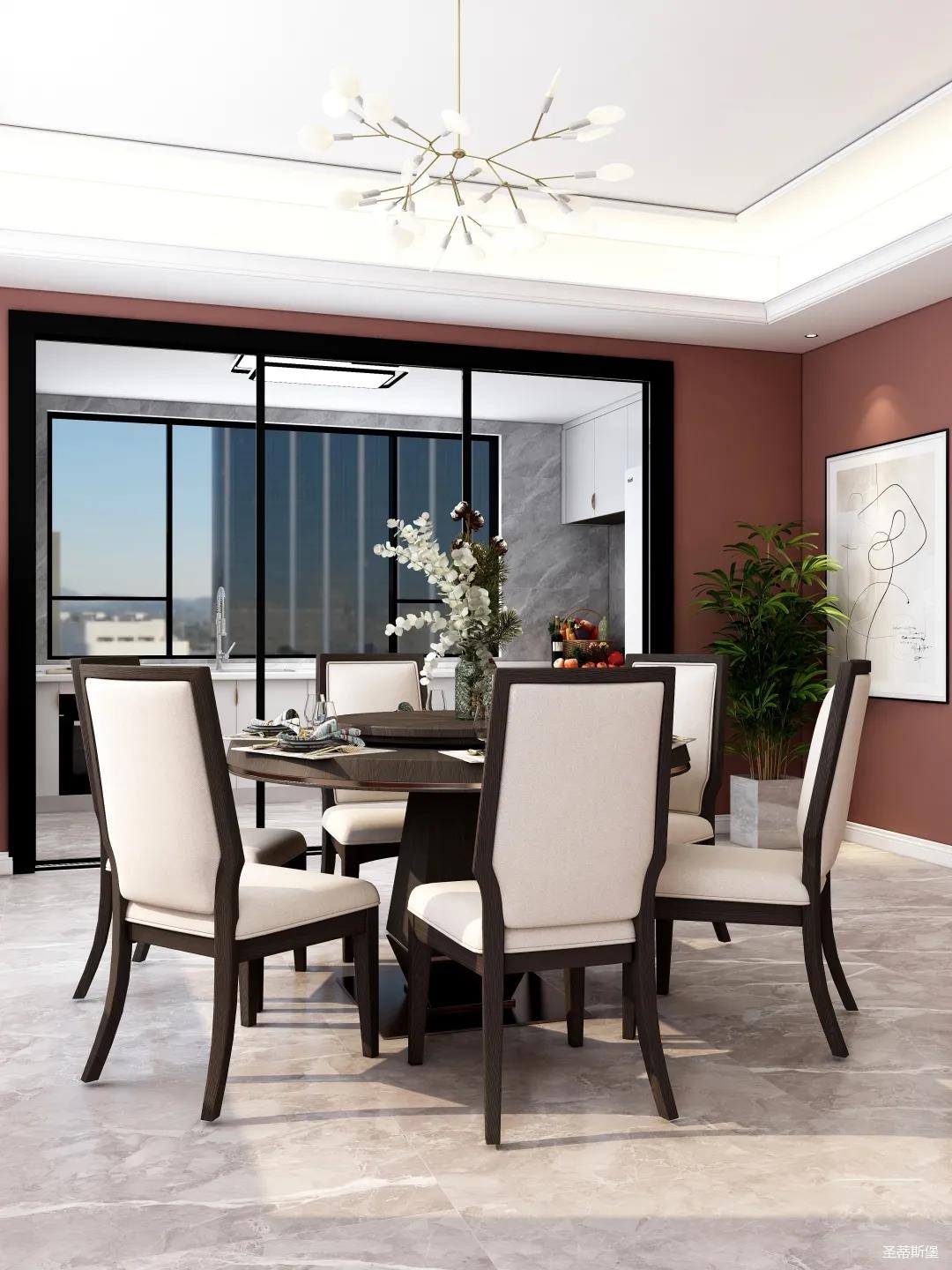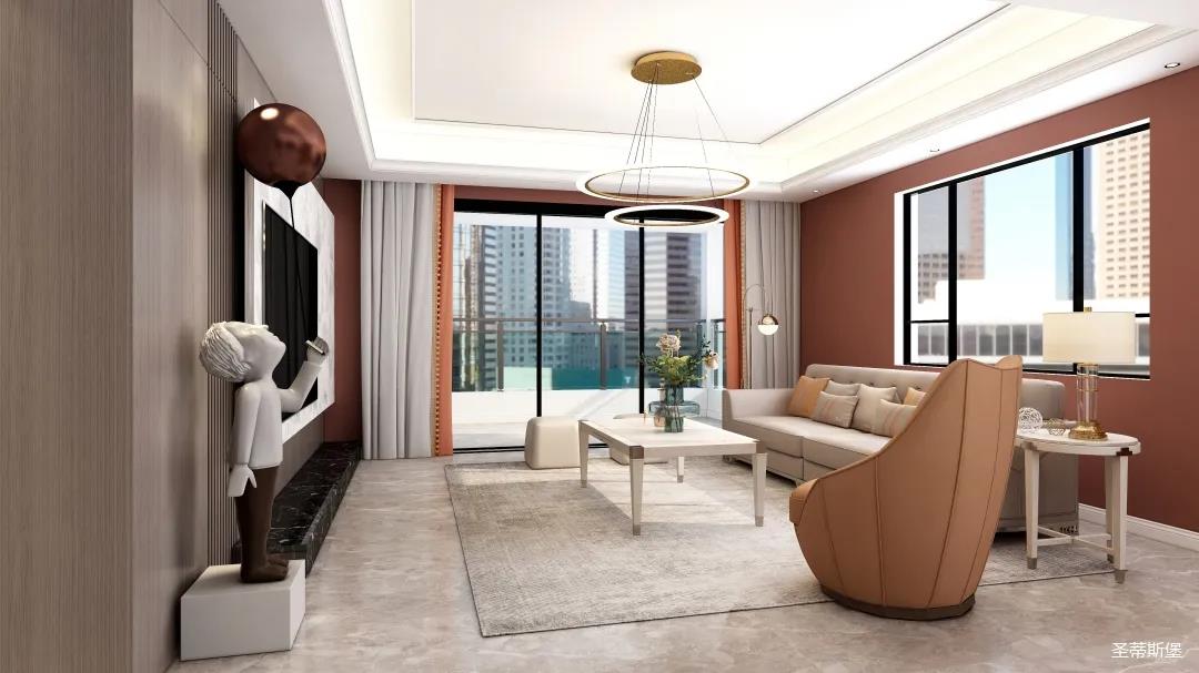 表姐不喜歡大白墻設計,于是設計師完美貼合表姐的喜好,摒棄了傳統(tǒng)的大白墻,將色彩跳躍的鐵銹紅應用于空間,從視覺上豐富了空間的層次感。南北通透的空間布局,讓視野更為清透明亮。