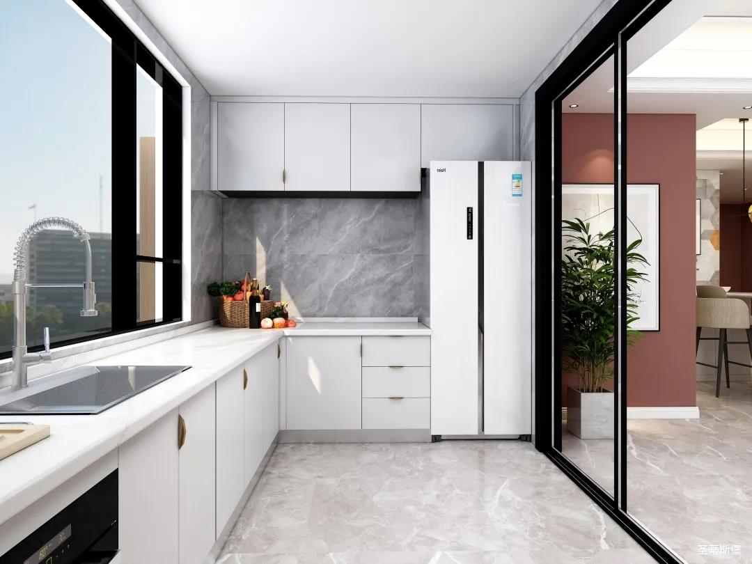 廚房是南北通透的U型空間布局,功能齊全且合理銜接,純白的柜體讓視野更開闊,用透明玻璃門隔斷,極大的提升了生活的品質。