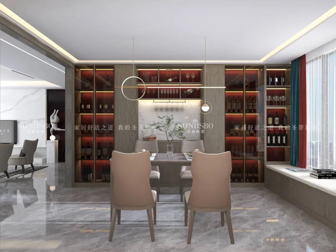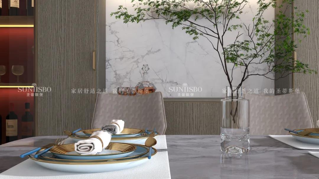 簡奢餐桌與玻璃大立柜,將空間簡化,帶來了純粹的空間視覺效果。金色鑲邊的點綴,為這份純粹增添了奢華質(zhì)感。極簡玻璃定制柜體,拉開了大空間的開闊視野,光影交匯間,硬朗的氣質(zhì)與柔和的自然光產(chǎn)生了趣味的互動,為空間提供了更具藝術(shù)張力的奢享用餐體驗。