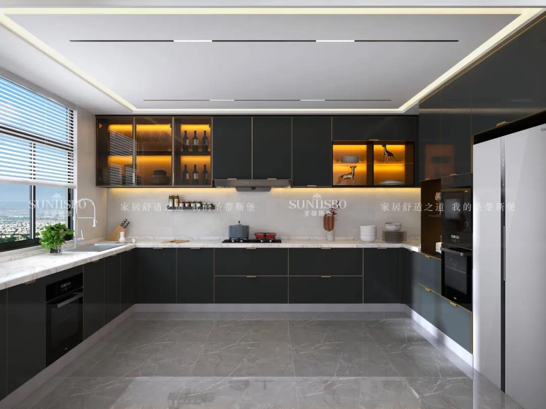視覺色彩是激活感官的情緒支點,以色彩為重心的櫥柜系統(tǒng),喚醒了簡奢廚房的關(guān)鍵所在。亮色金屬與深色實木柜體形成撞色櫥柜,極具空間爆發(fā)力。在深色柜體包裹中展現(xiàn)金屬、玻璃、實木的高級質(zhì)感,剛毅線條交錯延續(xù),一秒就點燃了時尚潮流的生活態(tài)度。