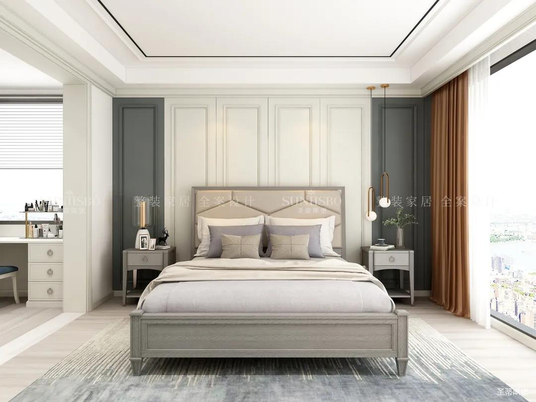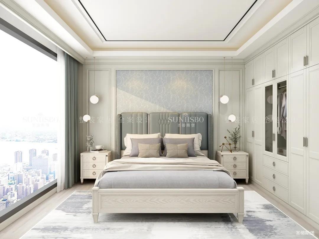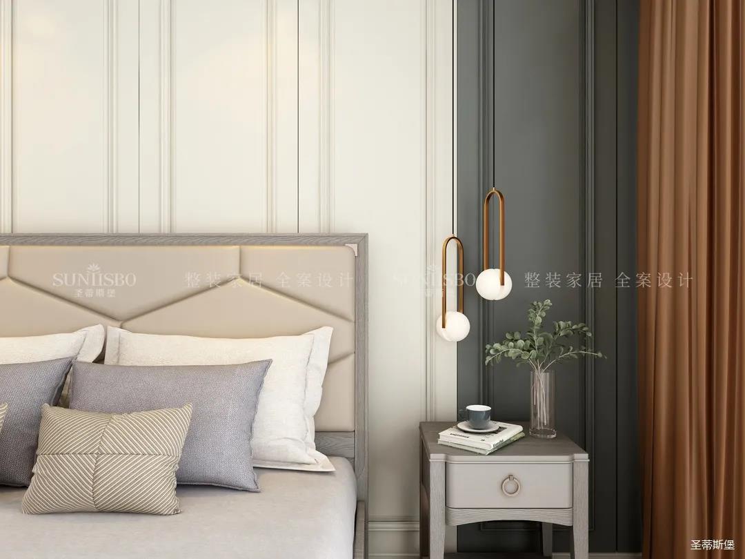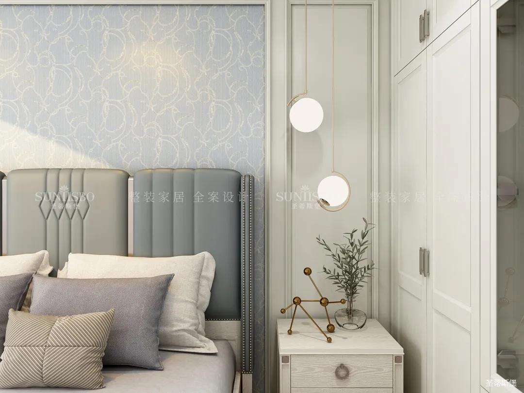 輕盈而明亮的實(shí)木飾面與超大落地窗,給次臥空間帶來了明朗的空間視野,莫蘭迪色彩交疊出最時尚的空間底色。定制衣柜對稱開合讓空間秩序規(guī)律又齊整,護(hù)墻選擇了淺藍(lán)色打底,雖是美式風(fēng)格,顏色卻沒有美式的厚重感,印花貼合著床屏,流線簡練利落,以簡致的維度詮釋著美式雅致的舒適生活。