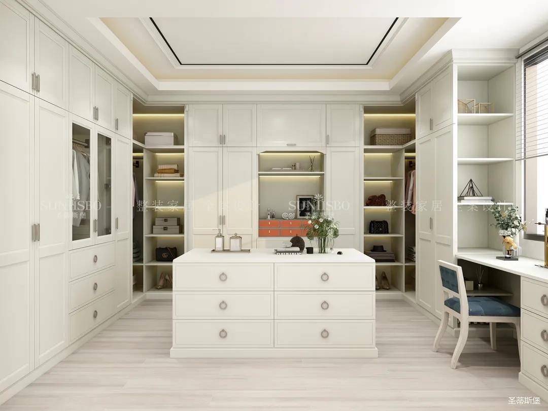 主臥側(cè)面就是獨(dú)立步入式衣帽間,以仿古白木質(zhì)紋理布局形成美式輕奢主題,設(shè)計模塊化的儲物,散發(fā)著濃郁的實(shí)木清新感,予人以飽滿而溫柔的情緒,內(nèi)嵌的智能感應(yīng)燈帶,讓時尚與輕奢形成輕微碰撞,讓收納力max+的同時也呈現(xiàn)出滿滿的質(zhì)感。