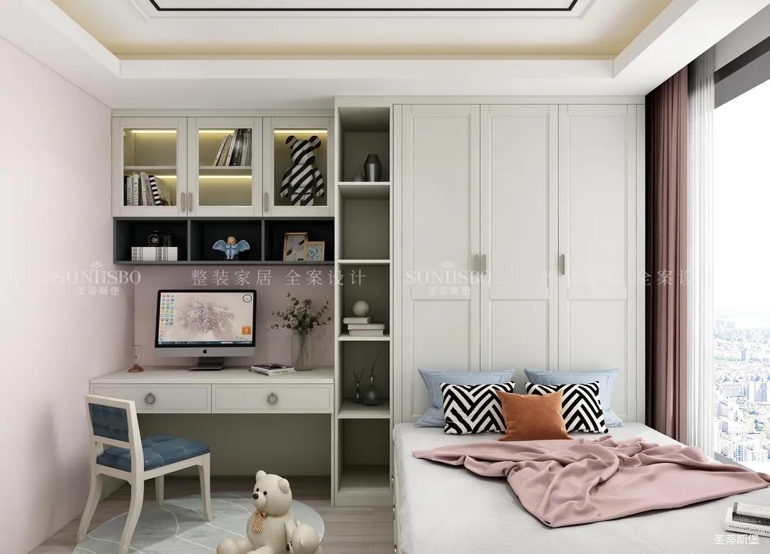 考慮到兒童身體免疫系統(tǒng)尚未成熟,抵抗力相對會較弱,所以空間采用了E0級全實(shí)木打造,少女粉墻體與仿古白柜體對應(yīng)搭配出兒童空間的平衡點(diǎn),典型的榻榻米+書桌的設(shè)計,既保證了足夠的學(xué)習(xí)區(qū),還兼顧著收納功能。