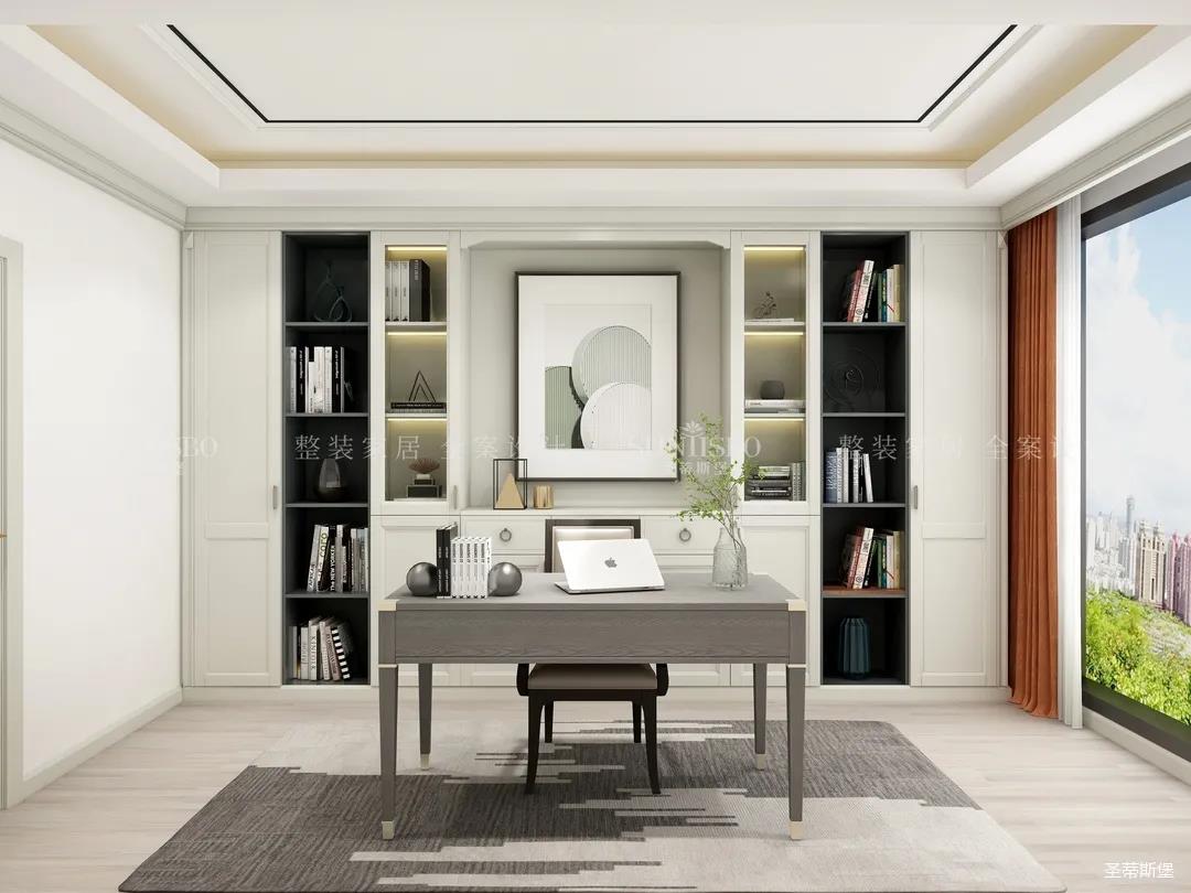 現(xiàn)代書房空間承載著更多的生活方式,它以各種形式出現(xiàn)在家的一隅。休閑之時,一杯清茶,一本書,靠著一張舒適書桌椅即可很好的釋放自己的思緒。書桌背后設(shè)計成嵌入式一字型書柜,對稱設(shè)計大氣美觀又實(shí)用。墻面利用率極高,而且能呈現(xiàn)出更加規(guī)整的空間感。