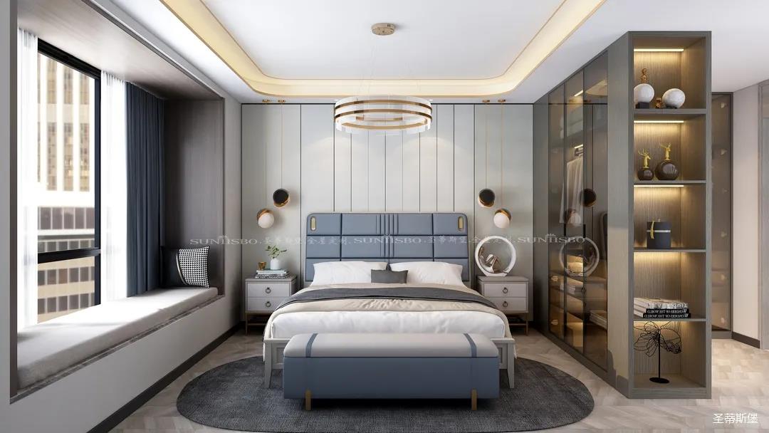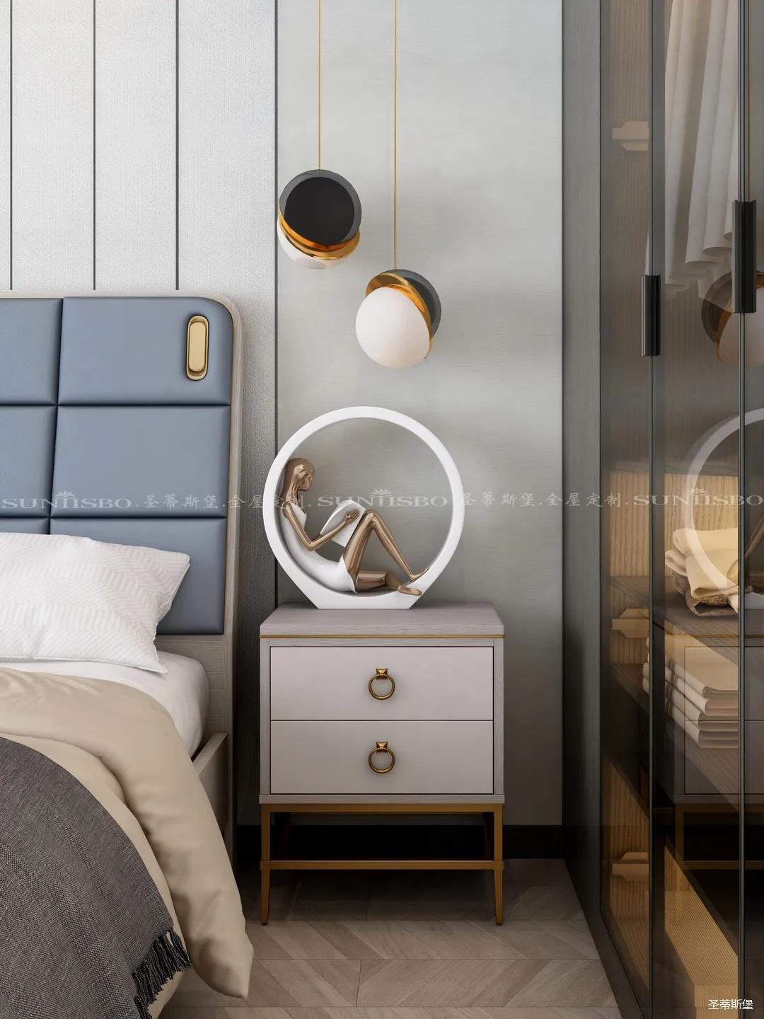 臥室的設(shè)計(jì)繼續(xù)延續(xù)著空間的高級灰,藍(lán)灰色彩的對比,讓主臥空間層次感更加豐富,充足的陽光隨意散落,空間更加溫暖大氣,對稱的球形吊燈設(shè)計(jì),恍如兩個(gè)“快樂星球”,展現(xiàn)著空間應(yīng)有的藝術(shù)性,設(shè)計(jì)師巧妙地設(shè)計(jì),營造出與眾不同的生活品質(zhì)。