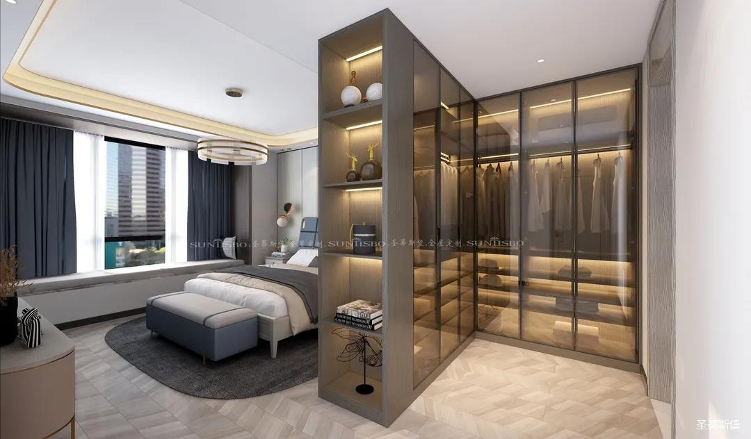 設(shè)計(jì)師不浪費(fèi)每一寸空間,將主臥的大空間劃分出一個(gè)步入式的L型衣帽間,當(dāng)即隔斷了進(jìn)門對床的尷尬,滿足了我一直以來擁有獨(dú)立衣帽間的夢想,它不僅是個(gè)收納場所,更是臥室的質(zhì)感體現(xiàn)。