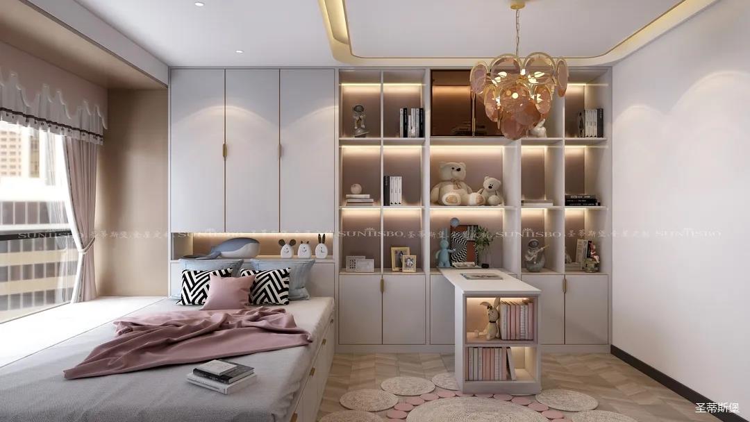 定制柜獨(dú)特設(shè)計(jì)滿足了女兒對臥室的功能需求,一字型定制柜挑出臺面設(shè)計(jì),直接打造便利書桌,視覺上將空間分割成兩個(gè)不同的趣味空間,實(shí)現(xiàn)了一房多用,簡直完美!