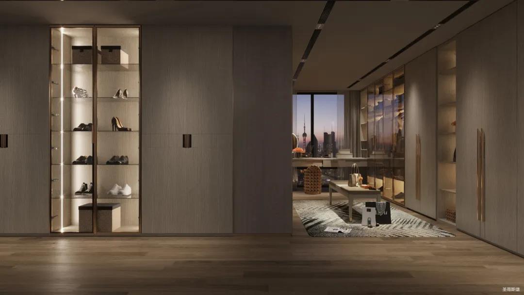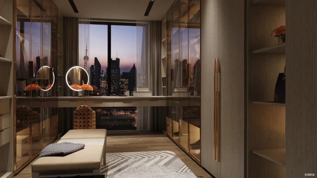 妝臺(tái)上隨心擺放的梳妝用品與櫥窗內(nèi)齊整的衣物收納形成鮮明對(duì)比,烘托出飽滿而真實(shí)的生活情境。人性化的合理分區(qū)收納也呈現(xiàn)了設(shè)計(jì)師在品質(zhì)與生活體驗(yàn)上的精細(xì)。