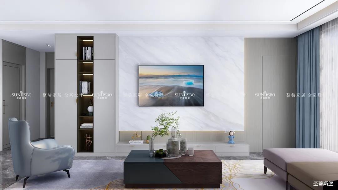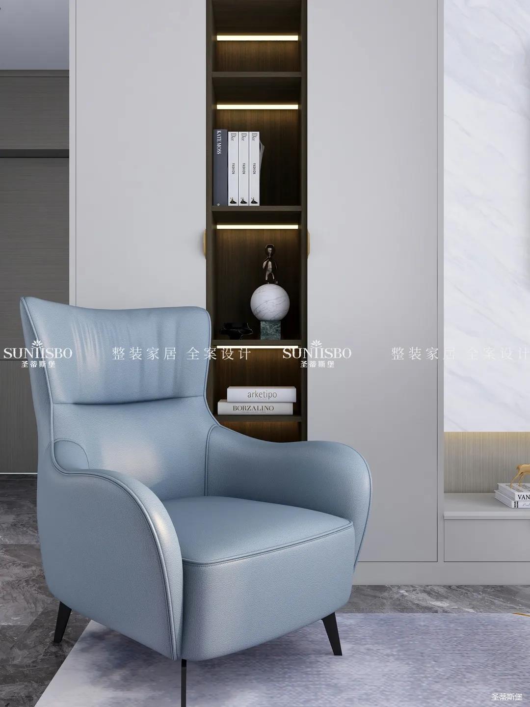 優(yōu)雅淺灰L型定制柜與紋理清晰的大理石組合電視墻,滿足了業(yè)主審美與實(shí)用的雙向需求。一張淡藍(lán)色的休閑椅,讓業(yè)主能感受到亮麗明艷色彩之外的獨(dú)特,低調(diào)不張揚(yáng),卻在溫潤中傳遞出色彩的力量。通過紋理清晰的護(hù)墻為底,為柔和優(yōu)雅的靜態(tài)客廳增添了層次感十足的空間律動(dòng)。