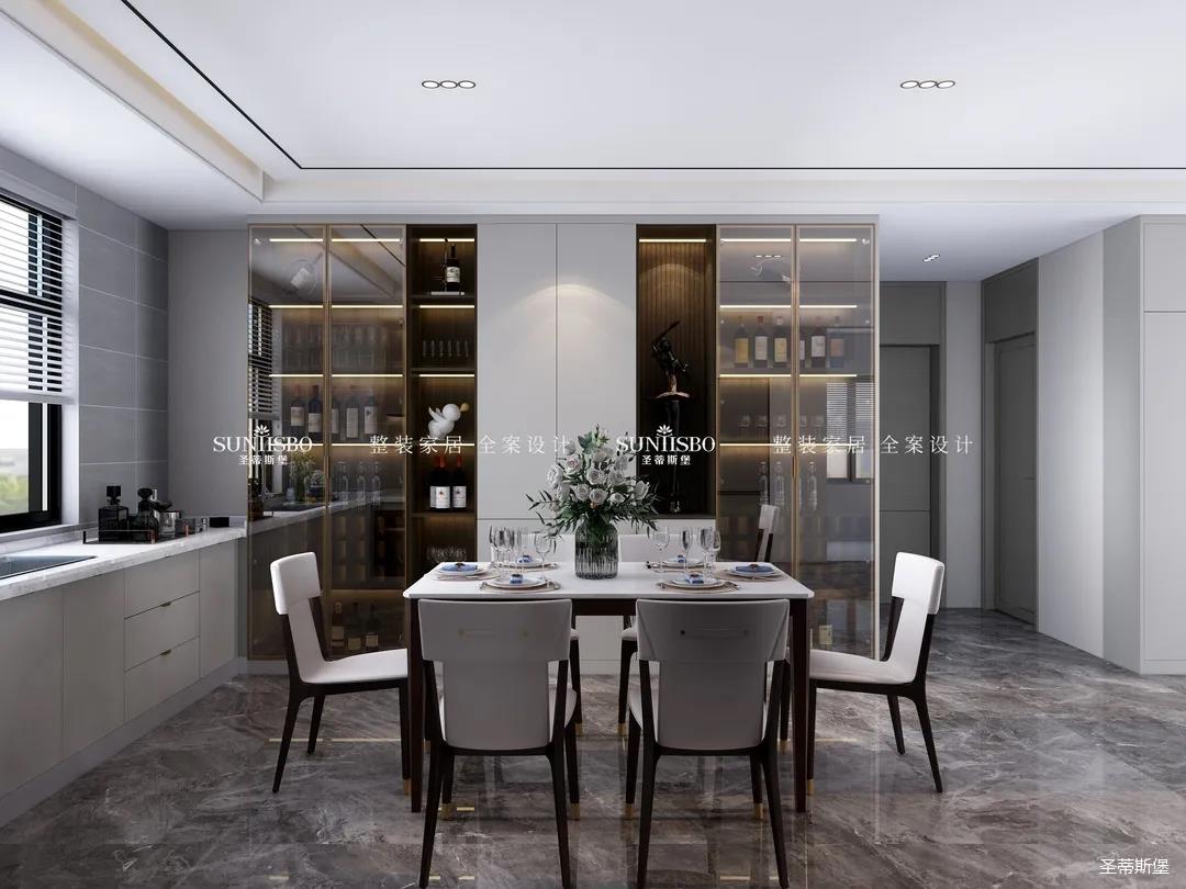 餐廳中大理石肌理的桌面自然袒露,自然親膚的觸感、皮革質(zhì)感的現(xiàn)代餐椅坐感舒適自然。沉穩(wěn)的實(shí)木材質(zhì)延伸,精致的瓷白餐盤搭配金屬質(zhì)感的物件,通透的玻璃器皿點(diǎn)綴其中,契合了業(yè)主對品質(zhì)生活的追求。