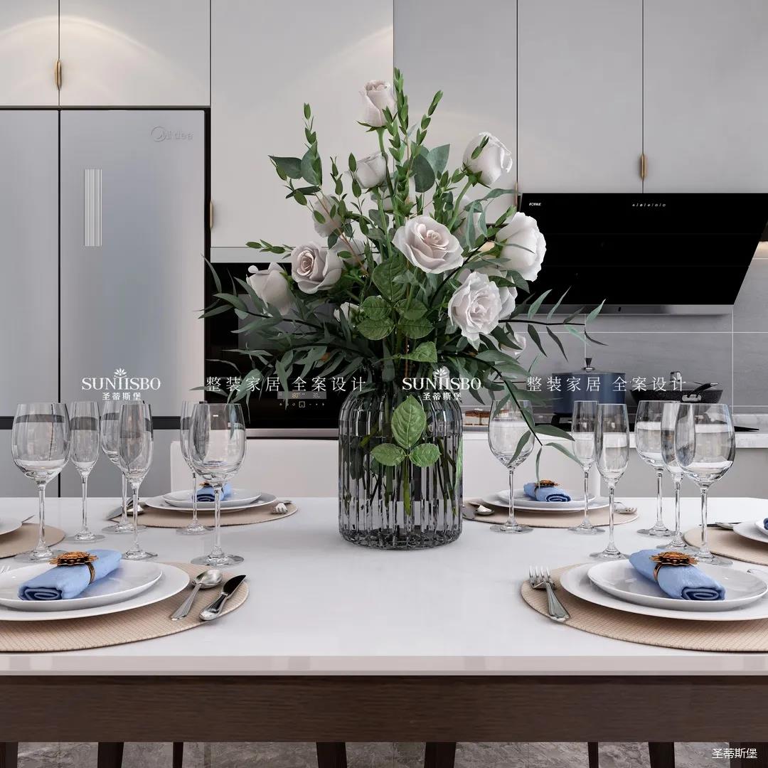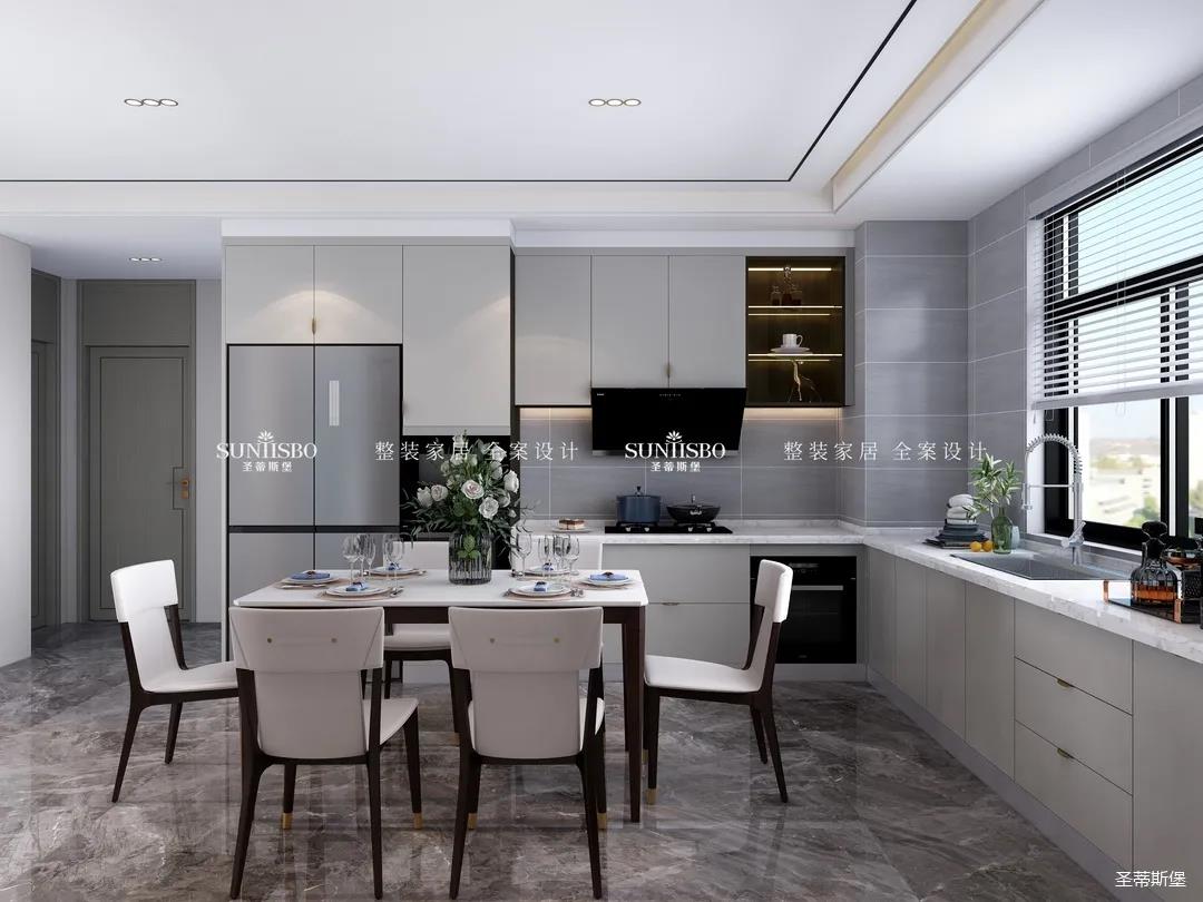 餐廚采用開放式布局,實(shí)現(xiàn)開闊明朗的公共空間,也提高了居家交流互動(dòng)的便利性。減少不必要的物件,加上合理的設(shè)計(jì),布局出和諧安全的居家環(huán)境。