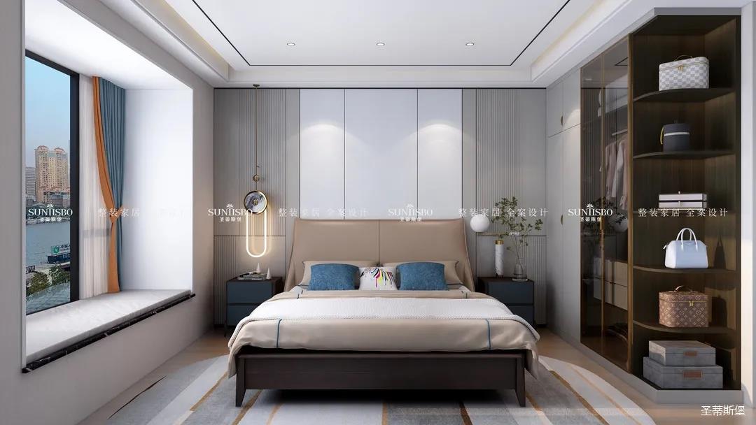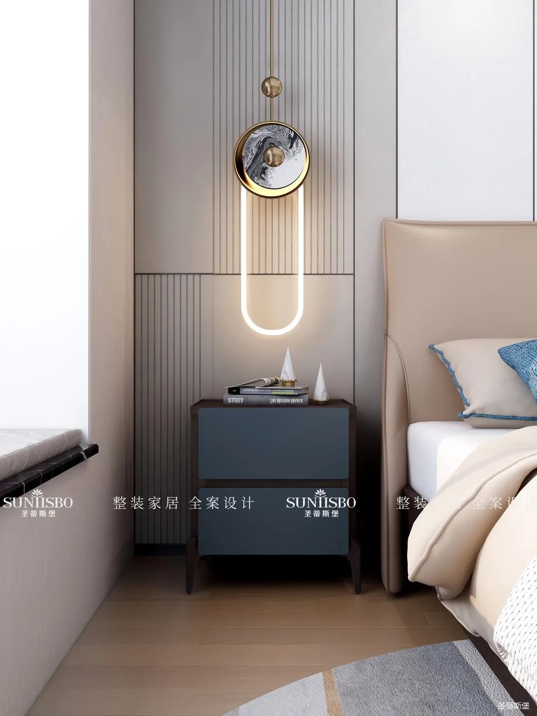 臥室把自然光線納入空間。穩(wěn)重的淺咖色床屏搭配柔和的灰白護(hù)墻,渲染了空間去繁從簡的設(shè)計(jì)。品質(zhì)精致的床品面料觸感自然柔軟,真皮質(zhì)地的家具匹配空間氣質(zhì),為業(yè)主營造了舒適愜意的休憩空間。