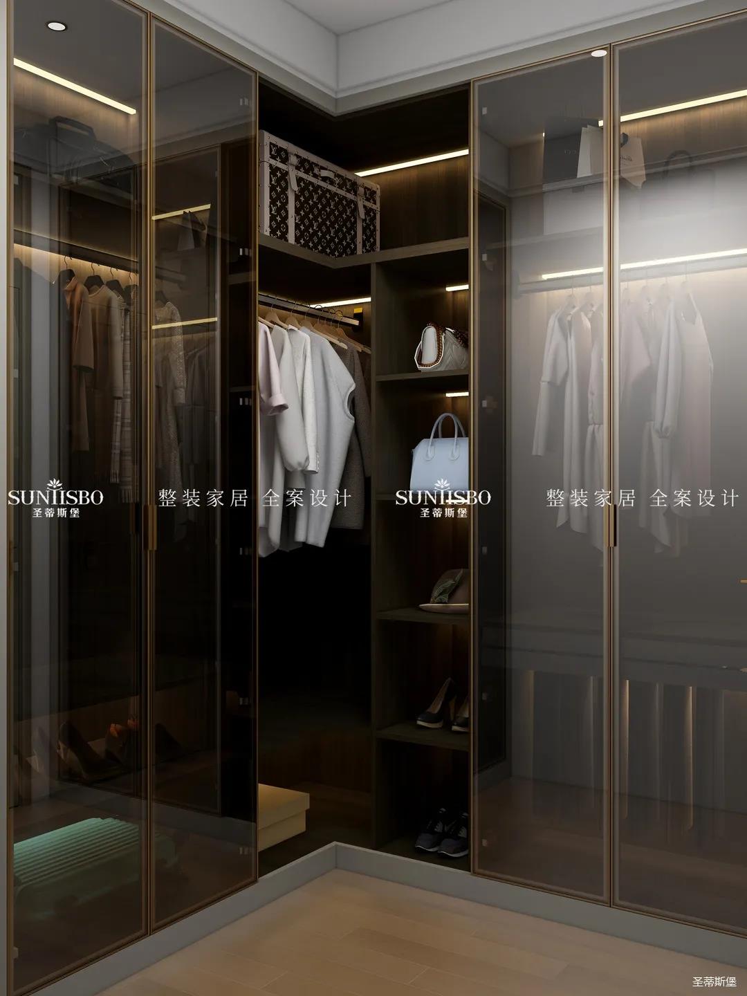 L型衣帽間采用了玻璃與實(shí)木組合,用時(shí)尚的煙熏色打造純凈質(zhì)感,避免了全實(shí)木柜門的無趣。人性化的分區(qū)包含了鞋架、褲架、首飾收納等,將衣帽間的實(shí)用性靈活設(shè)計(jì)成業(yè)主的收納習(xí)慣。