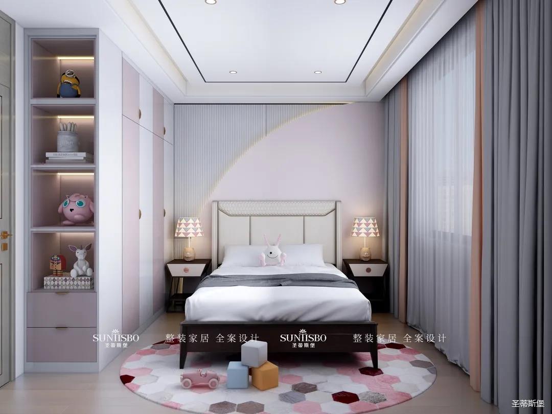 兒童房相對于其他空間更立體自然,幾何紋理的床屏和床頭柜延續(xù)了空間獨(dú)特的設(shè)計(jì)元素,菱格形的地毯,色彩交錯(cuò)排列,滿足了兒童房應(yīng)有的童真與想象力。粉白相間的定制收納,搭配同色系充滿童趣的動(dòng)物公仔擺件,儼然成為了兒童的夢幻小天地。