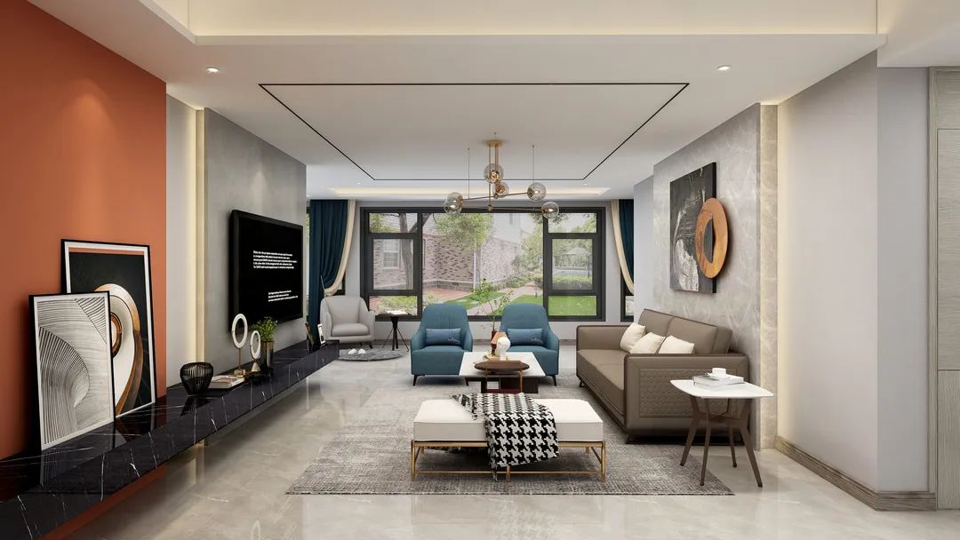 溫潤如玉的大理石、真皮材質(zhì)的沙發(fā)、金屬瓷器擺件